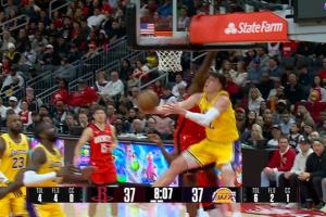 GIF-卡佩拉篮下防守拉拉维亚 拉拉维亚拉杆被筐帽 但是裁判认定有身体接触在先 火箭挑战失败