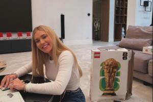 维尼修斯晒照和女友拼“大力神杯”乐高,旁边陈列柜摆放众多奖杯